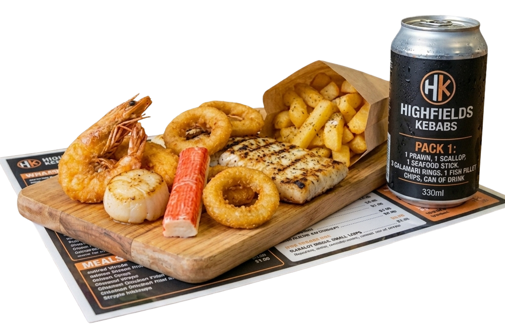 4 Prawns/4 sea scallops/ 4 seafood sticks/ 12 calamari rings/4 fish fillets/chips/1.25L drink